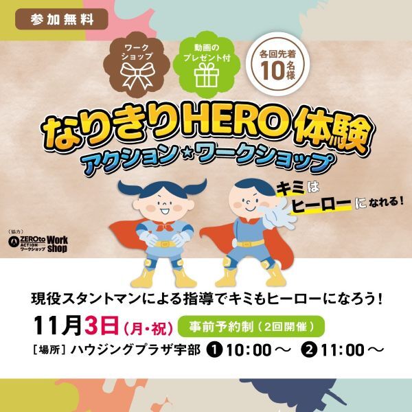 なりきりHERO体験 アクションワークショップ SCHEDULE 2025/11/03(月) ハウジングプラザ宇部 地図を表示 2025.11.3(月祝) なりきりHERO体験 アクションワークショップ場所:ハウジングプラザ宇部 ①10:00〜②11:00〜※事前予約制/定員10名 アクロバット体験教室 14時ごろ開催予定! 【講師】後藤渓心 ハウジングプラザ宇部イベント情報 URLをコピーする 報告する