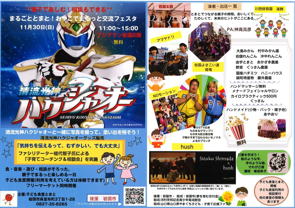 まるごととまと!おやこでまるっと交流フェスタ SCHEDULE 2025/11/30(日) フジグラン岩国6階 清流光神ハクジャオー単体撮影会/グリーティング 場所:フジグラン岩国6階 入場無料 グッズ販売ありチェキありサイン会あり URLをコピーする 報告する